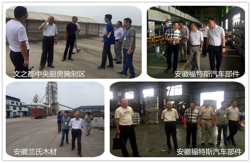 在桐城,走访了安徽文之都餐饮管理公司和安徽兰氏木业。二组理事(原大观区委主委)龙启斌带领童学军一行参观了中央厨房大型制作厂房,感受到餐饮服务市场新思路、新技术的创新模式。在怀宁,走访二组理事(原迎江区主委)胡孝德企业——安徽福斯特汽车部件有限,并参观标准化生产车间。