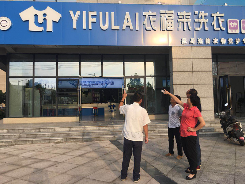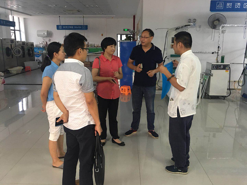 汪爱萍一行首先来到会员汪公明所属企业——衣福来洗涤科技公司。汪公明向大家详细汇报了公司的运营情况。衣福来洗涤公司是其在加盟洗福莱洗衣5年后自创的本地品牌,目前在安庆市场有4家线下洗衣店;现已和全国最大的线上洗衣平台e袋洗合作,并与顺丰快递携手完成线上线下的洗衣物流同城收送服务,即将打造成为集互联网洗衣、加盟连锁、洗涤设备、洗涤用品、产品研发和技术转让为一体的新型洗涤科技公司。