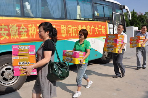 8月2日下午,安庆民建大观总支在市委会副主委祖兵的带领下,组织部分企业家会员,冒着高温到安庆市大观区皖河农场、海口镇、山口乡为抗洪防讯奋战在一线的广大干群送去西瓜、矿泉水、方便面、十滴水、仁丹等慰问品。