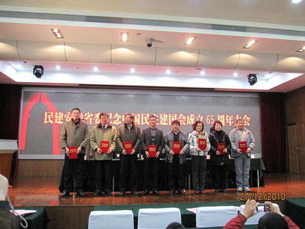 2010年12月26-27日,民建安徽省委召开纪念民建成立65周年暨民建优秀会员、先进集体表彰大会。民建安庆市委会组宣科科长冯晓斌,大观总支三支部主任、安庆文都餐饮有限公司董事长龙启斌,代表安庆民建参加了会议.