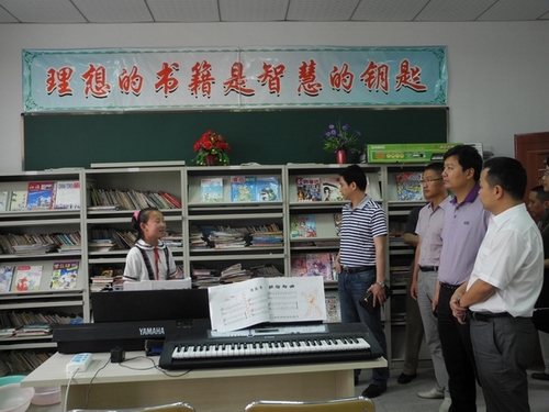 上午九时许,慰问活动在孩子们的朗朗书声里拉开了帷幕,为了不影响孩子们上课,大家悄悄地把捐赠的水果牛奶等价值一万余元的慰问品送到学生食堂,悄悄地为两名特困学生留下慰问金,又悄悄地参观了整个校园。在刚建成的学校操场前,韩承香校长的对学校的概况作了简要介绍,听完后,领导和会员们看着学校整齐明亮的教室、微机室、艺术活动室、心理咨询室、亲情联通室、图书阅览室、体育活动室、留守儿童餐厅等硬件设施,对留守儿童能在这样的条件下学习表示满意。