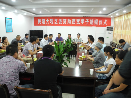 2012年8月22日下午,民建大观区委携企业家会员来到中共大观区德宽街道办事处二楼会议室,参加“民建安庆市大观区委资助德宽学子捐赠仪式”。中共市委统战部党派科科长马自水,大观区委统战部部长周水旺,民建安庆市委会秘书长冯晓斌、常委江连富出席了捐赠仪式。