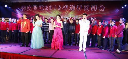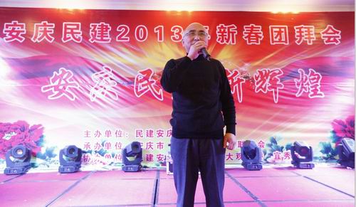 龙年共庆辉煌日; 蛇岁同奔锦绣程。2012年元月26日下午,由民建安庆市委主办,安庆(民建)企业家联谊会承办的主题为“安庆民建新辉煌”2013新春团拜会在天域大酒店举行。中共安庆市委统战部常务副部长邵光、副部长江宏滨、余玉金,民建安庆市委副主委刘来富、石再华、汪爱萍,中共迎江区政协副主席、统战部部长钱军、大观区委统战部部长周水旺、宜秀区政协副主席、统战部部长唐克志等领导和嘉宾与安庆民建全体会员一起参加了团拜会,共贺新春。