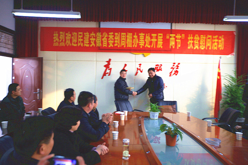 2014年1月3日,在民建安徽省委常委、安庆市委主委童学军的带领下,安庆市(民建)企联会部分理事一行十二人前往阜阳颍泉区周棚办事处,进行了两节扶贫慰问。