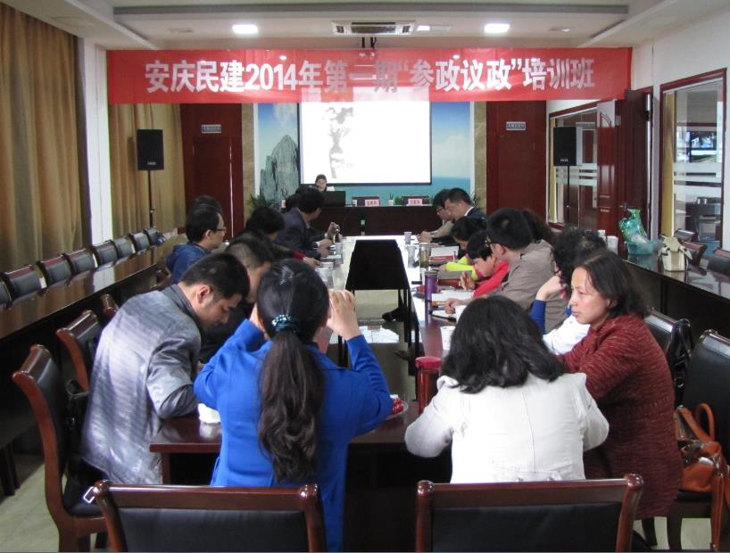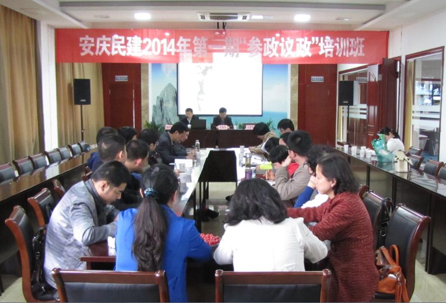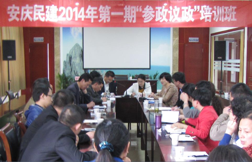 2014年4月13日,安庆民建在百科实业有限公司4楼会议室,举行2014年第一期“参政议政”培训班。调研委全体成员和各区委分管领导、调研骨干参加了培训。会议由民建安庆市调研委主任王国俊主持。民建安庆市专职副主委石再华,副主委汪爱萍出席会议。