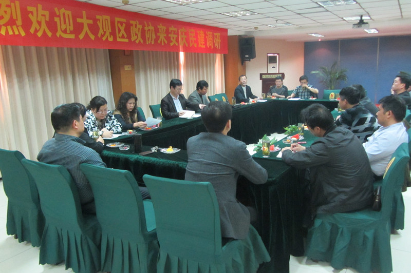 2014年4月29日,安庆市大观区政协民族宗教和港澳台侨联络委员会委员在区政协副主席张剑雄带领下来安庆民建调研,受到民建安庆市委会的热烈欢迎。张主席一行首先参观了安庆市东部新城综合写字楼和民建安庆市委会办公场所,随后双方举行了座谈会,进行会务交流。会议由民建安庆市委会专职副主委石再华主持。