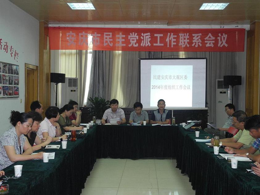 7月20日上午,民建安庆市大观区委在区委会议室召开2014年度组织工作会议,区委全体成员、各支部主任和调研委负责人参加会议,民建安庆市委会秘书长、组宣科科长冯晓斌出席会议。