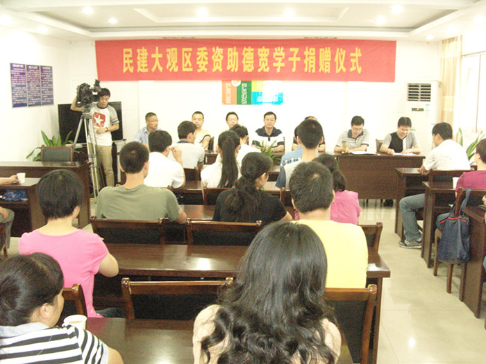 8月17日上午,民建安庆市大观区委捐资助学活动在安庆市大观区德宽街道会议室举行。德宽街道所辖六个社区的七名贫困大学生、六个社区负责人、民建大观区委班子成员及六个支部负责人、德宽街道相关同志参加了仪式。民建安庆市委会专职副主委石再华、中共安庆市委统战部党派科科长马自水、民建安庆市委常委江连富、区委统战部常务副部长汪庆生等应邀出席捐赠仪式。活动由德宽街道党工委书记、街道办事处主任魏学贤主持。
